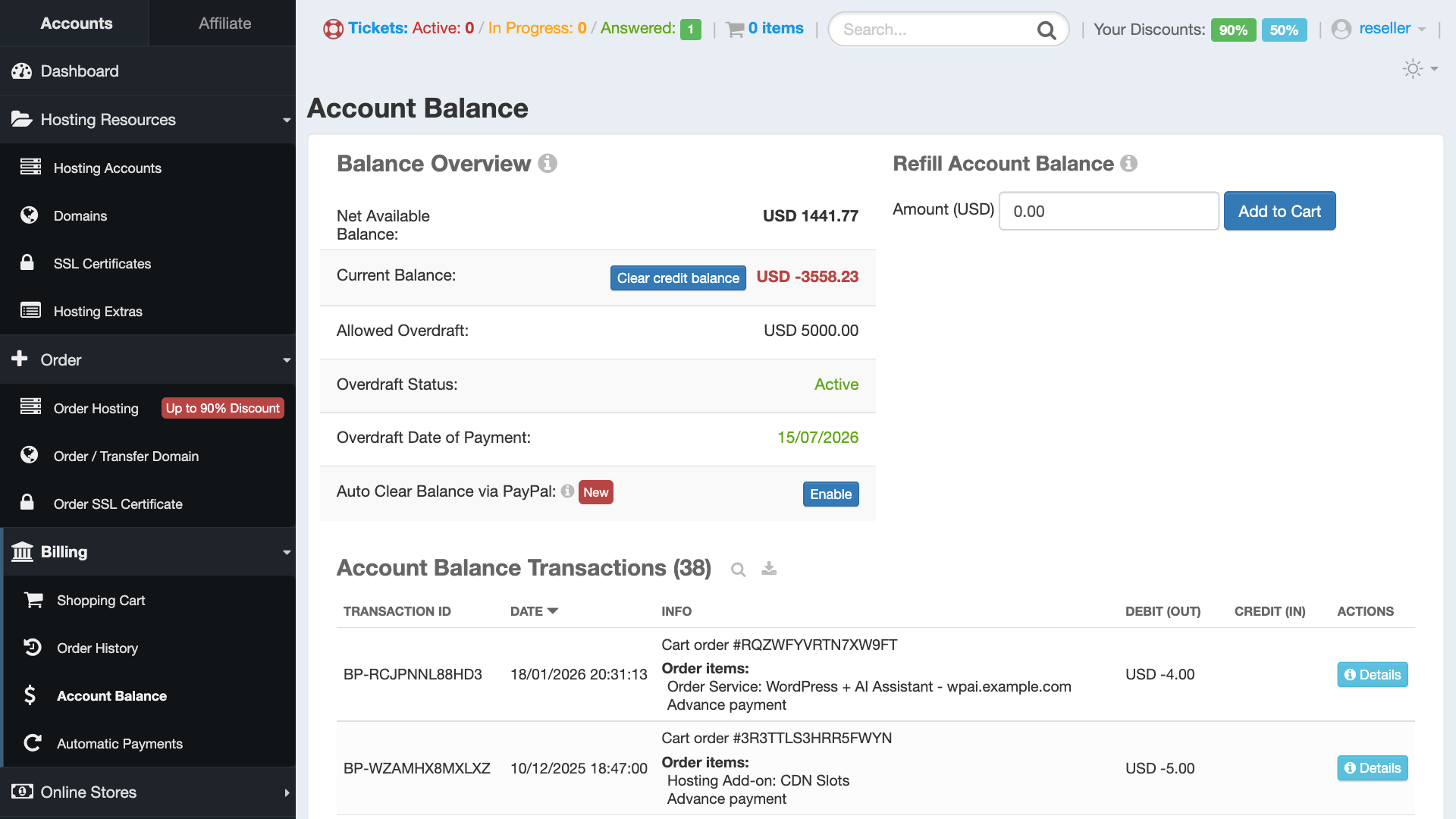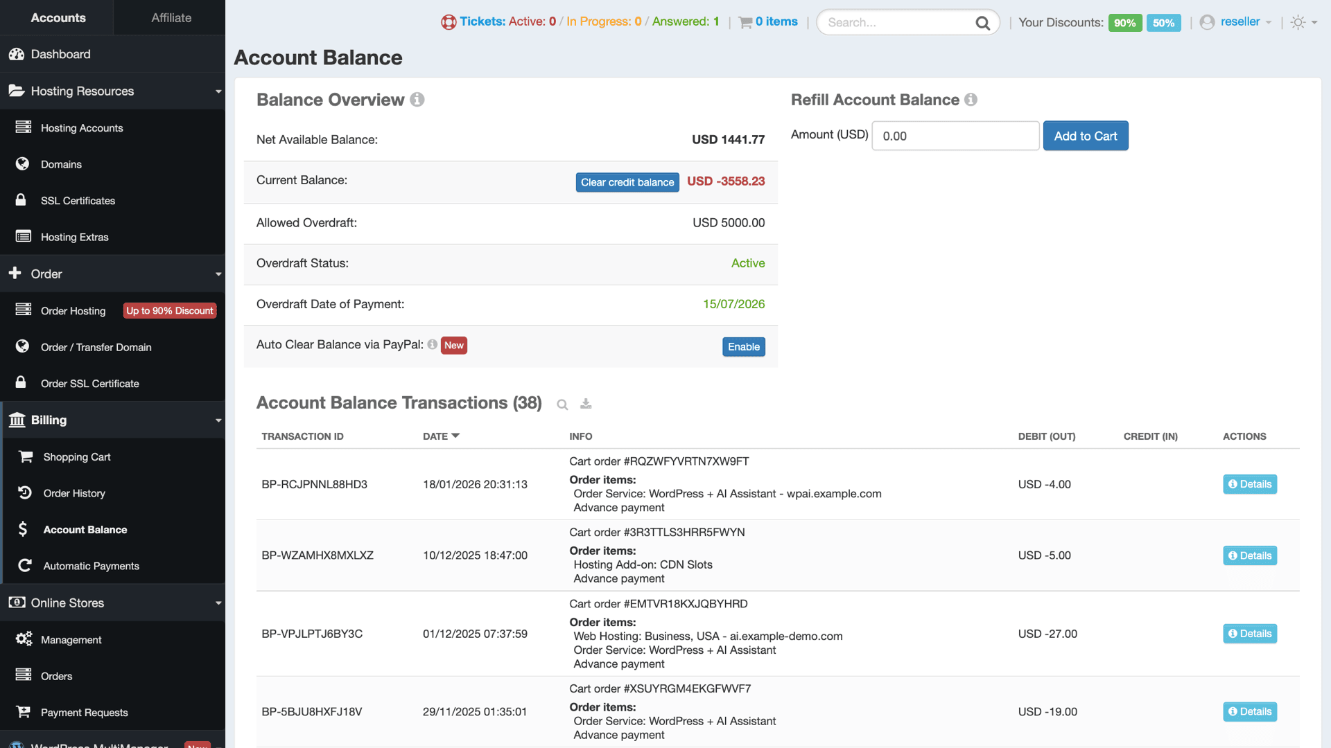 The overdraft amount is calculated according to a dynamic formula, based on the number of accounts/services in the ICDSoft Account Panel. The more active services you have in your partner account, and the longer they are prepaid for, the greater the amount of the allowed overdraft will be. Further information is available for logged in users in the Help section of the Account Panel:
