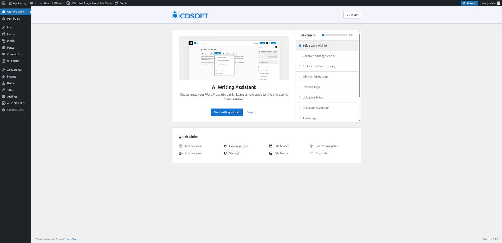 Launch your WordPress site in minutes with our fully integrated AI assistant. From the very first click, you'll get smart content suggestions, intuitive setup guidance, and automated tools that help you build and manage your website faster - all in one streamlined experience.